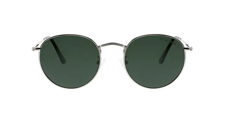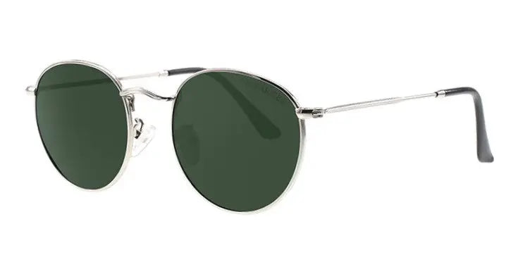 Diese Sonnenbrille ist aus silbrigen Metall vollendet mit schwarzen Bügelenden. Sie ist retro, rund und total angesagt! Ein Klassiker für Jeden! Ist auch mit grauen Gläsern erhältlich.